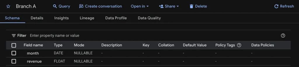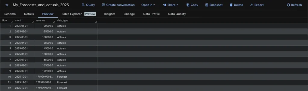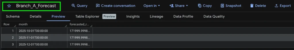 Step 8: Open the target project and dataset in BigQuery to confirm that the new table, “Branch_A_Forecast,” has been created. The table should contain forecasted revenue values for October through December 2025.