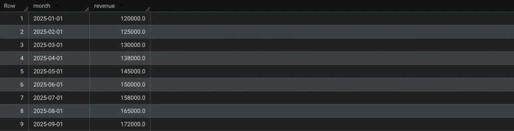 Context 2: The table contains revenue values from January to September 2025, representing three completed quarters. The objective is to perform business forecasting to estimate revenue for the fourth quarter of 2025.