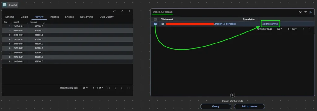 Step 10: Enter “Branch_A_Forecast” in the search field. Once the table appears in the results, select it and click “Add to canvas” so it becomes part of the workflow.