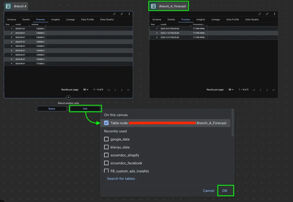 Step 11: The forecast table will appear as a new node in Data Canvas. Click the “Join” option below the original “Branch A” table and select the forecast table, then confirm to create a connection between the datasets.