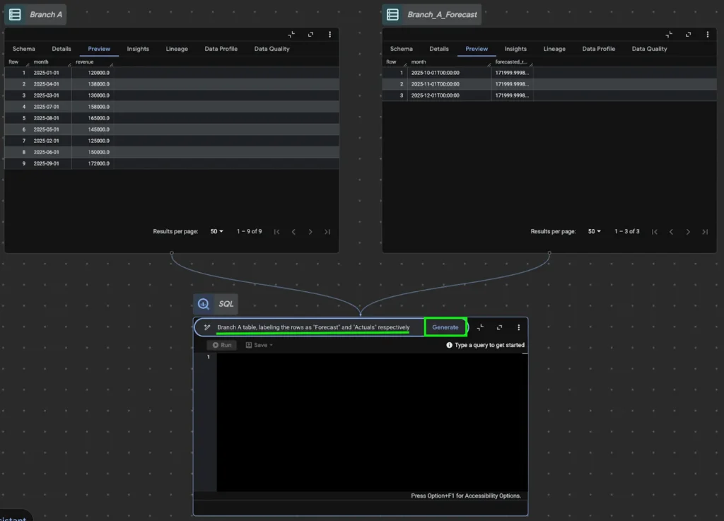Step 12: A new node will appear showing the relationship between the two tables. Remove the default query and enter a prompt such as “Append the data from the Branch_A_Forecast table to the Branch A table, labeling the rows as ‘Forecast’ and ‘Actuals’ respectively.” Generate the SQL code to combine the datasets.