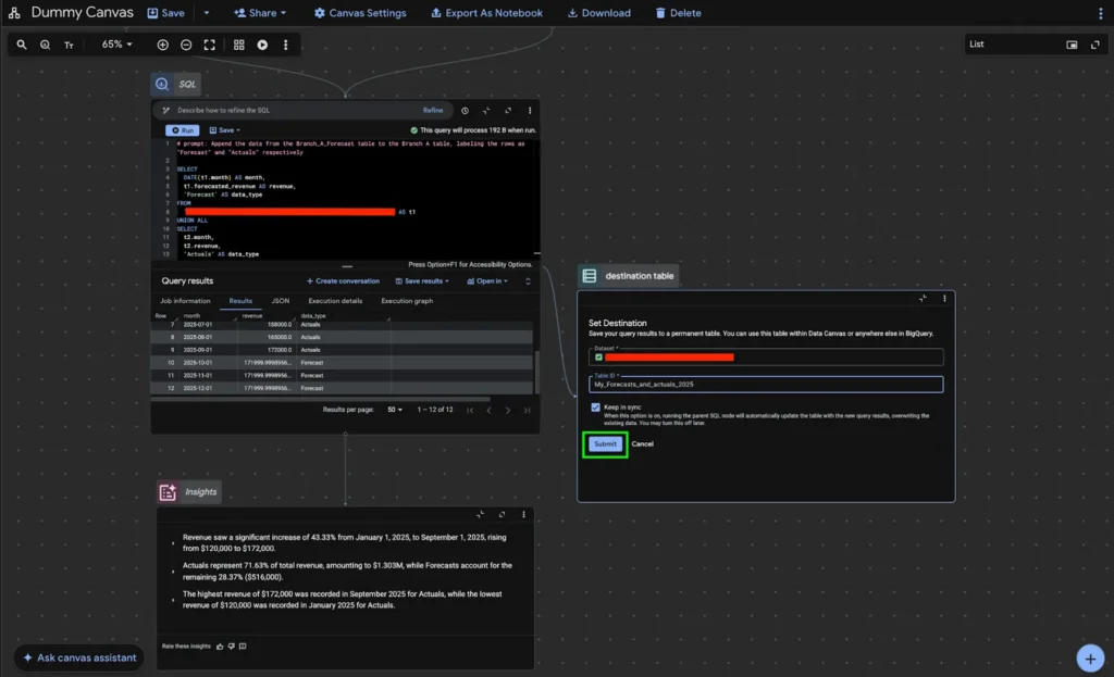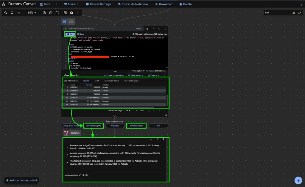 And that concludes this example of implementing business forecasting using BigQuery Data Canvas. This workflow shows how historical data can be prepared, forecasted, and integrated back into the data environment to support structured analysis.