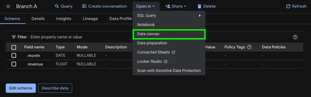 Step 1: In the table view inside BigQuery, click “Open in” in the menu bar and select “Data Canvas.” This loads the selected table in the Data Canvas interface.