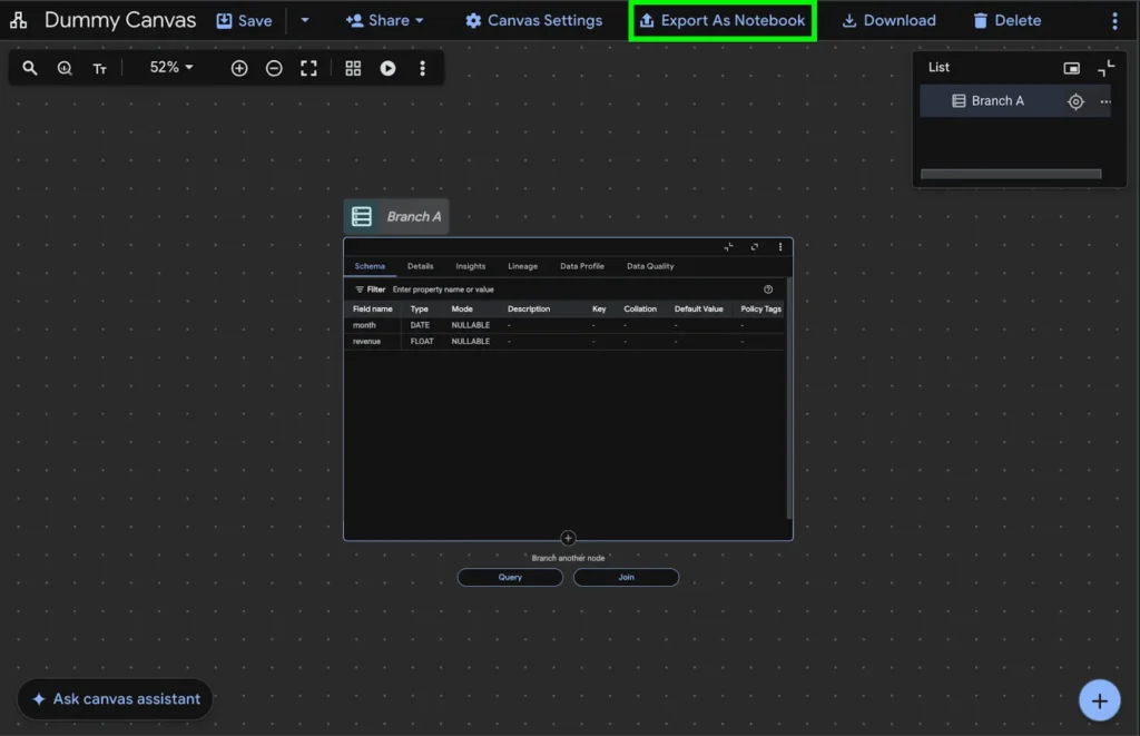 BigQuery Data Canvas is a feature in BigQuery that allows analysts to find, query, transform, and visualize data using a graphical interface and natural language prompts. It presents analysis workflows in a visual format, allowing datasets and query results to be explored within the same workspace. Data Canvas can also generate SQL queries, charts, and summaries, making it easier to move from raw data to insights. It also allows workflows to be exported as notebooks that support Python, which can be used for business forecasting and other analytical tasks.