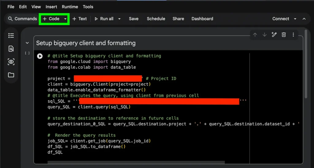 Step 3: After selecting “Export as Notebook,” a prompt will appear to name the notebook and enable required APIs. After completing these steps, the notebook will open. The first code cell contains inspection code that displays the dataset schema when executed. Click “+ Code” in the menu bar to insert a new code cell, which will be used for the forecasting code.