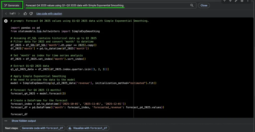 Step 5: Select “Generate with AI” and enter a command describing the forecasting task. For example, input “Forecast Q4 2025 values using Q1–Q3 2025 data with Simple Exponential Smoothing.” Submit the prompt, and Gemini will generate the corresponding Python code for forecasting.