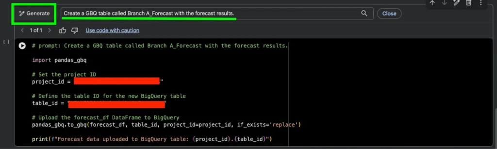 Step 6: Insert another code cell below the forecast code. Enter a prompt such as “Create a GBQ table called Branch_A_Forecast with the forecast results.” Gemini will generate code that creates a destination table and saves the forecast output.