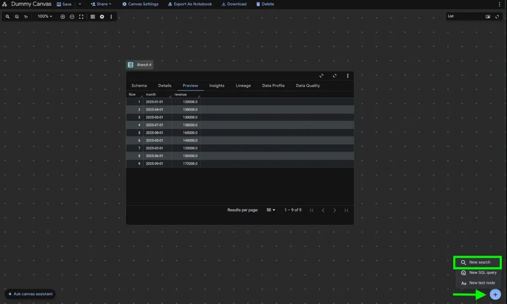 Step 9: Return to the Data Canvas tab and click the “+” button in the lower corner. Select “New Search” to locate additional tables within the project.